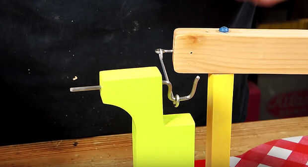 Atornille un tornillo de ojo en el centro del extremo del brazo del oscilación. Conecte el tornillo de ojo para la U de la barra de hélice con algún alambre. Puede que deba jugar con la longitud del cable para hacer que funcione sin problemas. Esta parte toma paciencia y algún ensayo y error, así que Diviértase con él!