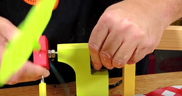 Doblar una barra de acero de 1/8" con forma de U en un extremo. Deslice a través del apoyo de la hélice. Utilice algunas tuercas como separadores y pegamento caliente la hélice en el otro extremo.