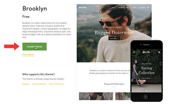 Haga clic en el tema instalar y publicar como tema de mi tienda para iniciar el proceso de instalación. Hecho esto, haga clic en ir a su gestor de temas. Debería ver "ver su tienda en línea" Si coloca el ratón sobre la pantalla aquí. Haga clic para ver la tienda. Se ve un poco diferente ahora y tenemos esta presentación para jugar con. Vamos a seguir adelante y subir la primera imagen del slideshow.