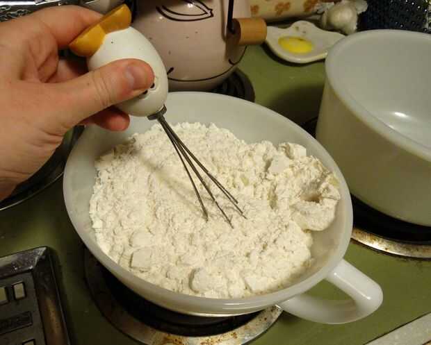 Usar un batidor para tamizar juntos los ingredientes de. Me gusta usar un bate en lugar de una cuchara mezcla porque los gránulos pueden fluir libremente entre los cables, ayudando con distribución uniforme y reducir el riesgo de arrojar la harina fuera de la vasija.