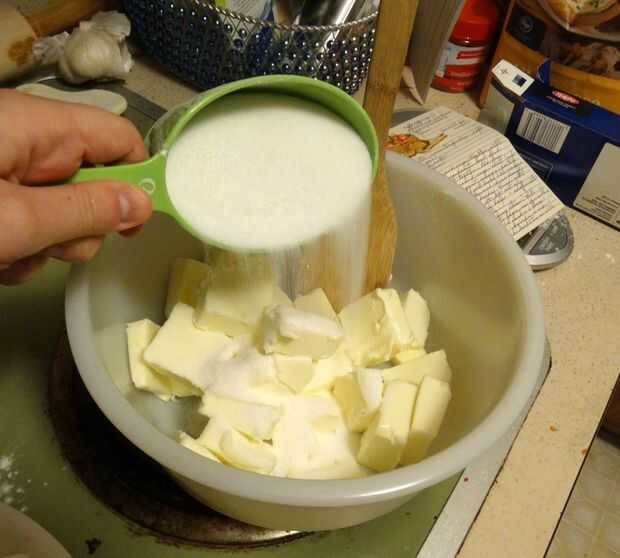 Añadir el azúcar a su taza de mantequilla y utilizar la cuchara de madera para puré y doblar la in de azúcar. Trabajar hasta tener una pasta espesa, fornida con azúcar distribuido uniformemente en todas partes.
