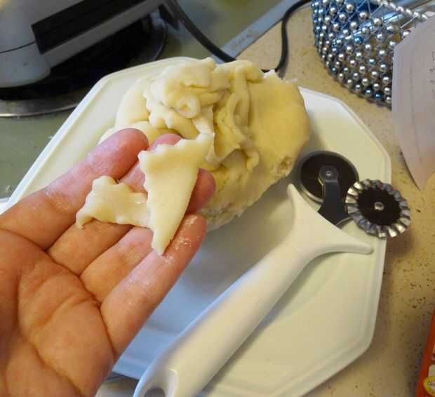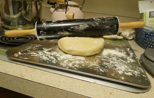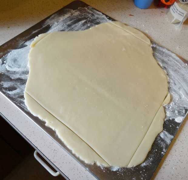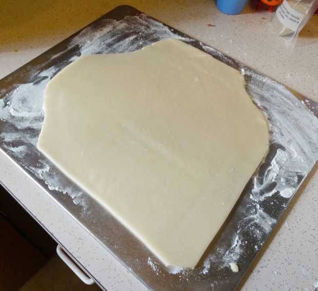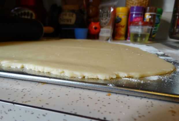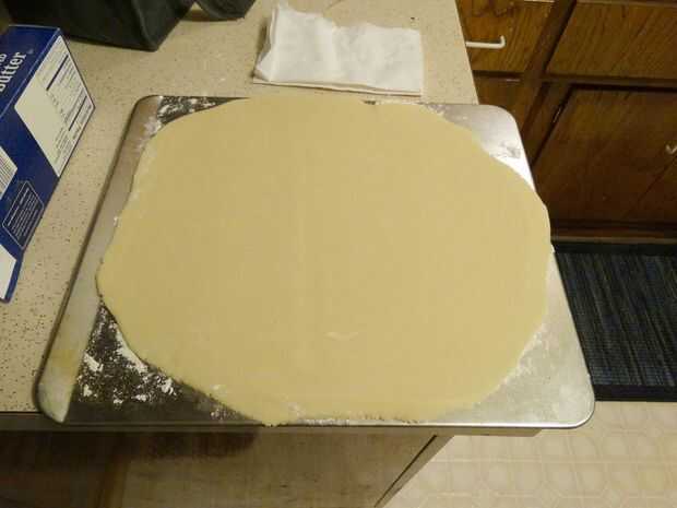 Rollo de planos, hasta obtener una masa alrededor de 1/4 pulgada de espesor, enharinados su masa y el rodillo según sea necesario para evitar que se pegue y rasgue.