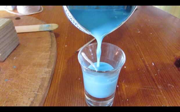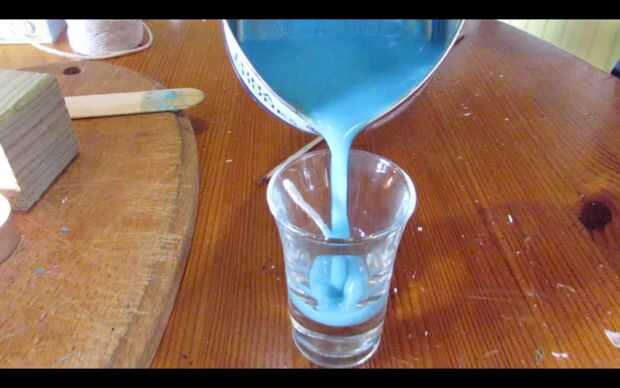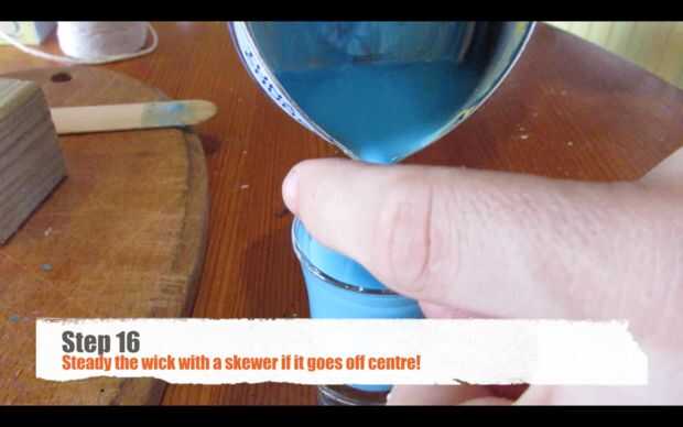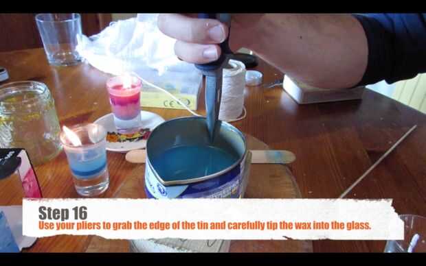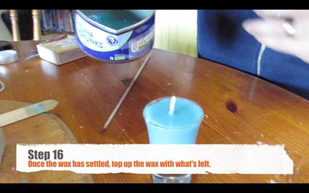 Una vez que la cera se ha establecido un poco, vierta cualquier cera sobrante en el vaso al comienzo para arriba. Como la cera se enfría, se sumerja en el medio un poco así que trate de hacer la cera sit 'orgulloso' (golpes hacia arriba) cuando termine de verter.