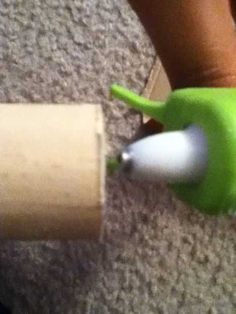 Poner pegamento caliente en un extremo de la varilla de pasador e inserte a través del rodillo de la cinta para sujetar al popper del partido.