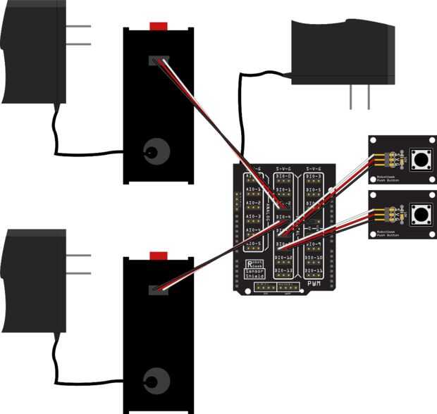 No es demasiado difícil de alambre una vez que tengas las bombas montadas con su respectiva alimentación, relé y botones de cebado. Se recomienda utilizar el protector del Sensor RobotGeek con este proyecto de limpiar el cableado, aunque se puede hacer con un protoboard con cierto esfuerzo y un montón de cables de puente.