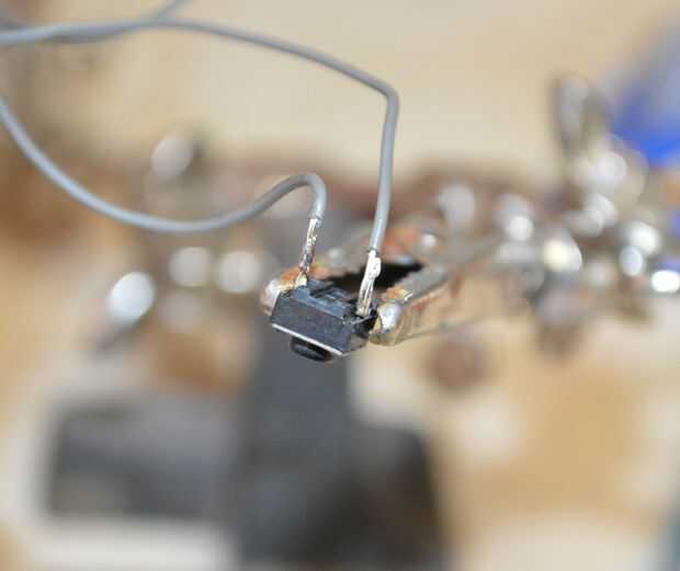 4. por último, pegue el interruptor en su lugar. El interruptor micro usé sólo tenía 2 pins y me aseguré de que estos fueron empujados en los agujeros y luego dobló las piernas hacia fuera dentro de la cáscara.