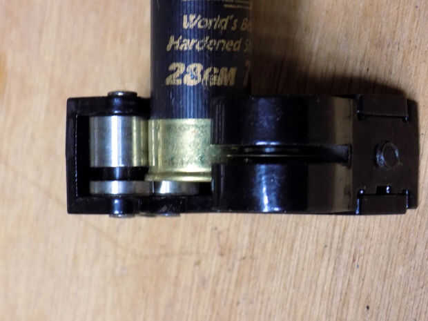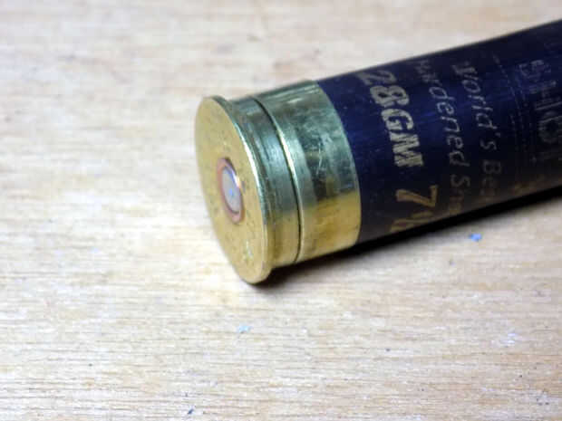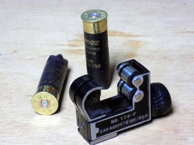 2. Coloque uno en el cortador de tubos de cobre y gire cuidadosamente la cáscara mientras aprieta la cuchilla. Ayuda si pones algo sólido por la concha como una toma de corriente. Esto asegurará que la cáscara se mantiene verdadera y presión se agrega uniformemente.