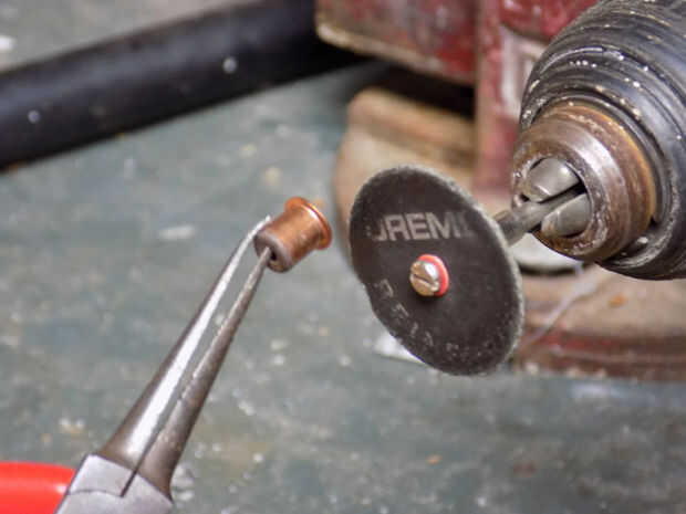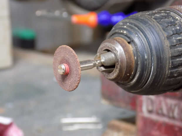 2. Ajuste la dremel o el taladro por lo que tiene un disco de corte pequeño atado como la por debajo de la imagen. Mi Dremel murió por lo que he tenido que montar mi taladro para hacer el corte.