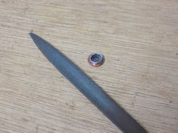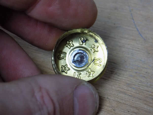 5. Empuje hacia atrás la cartilla en el orificio de la tapa. Lo cool de esto es debe trabar en su lugar. Es por ello que desea conservar un poco del cuerpo en la cartilla. Al principio soldadas en lugar pero la soldadura sólo filtraron por todas partes. Por no cortar al ras la cartilla, significa que hay suficiente para que la cerradura en el agujero. Puede que necesite pulsar el cebador en su lugar con un destornillador, el ajuste puede ser apretado.