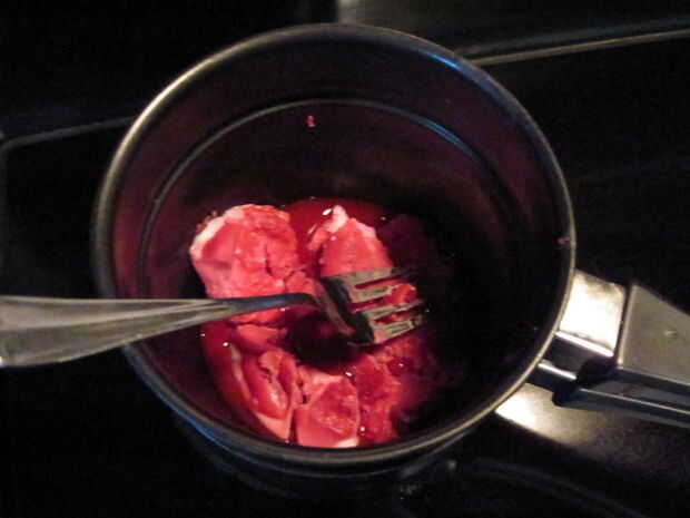 Picar encima de la cera de vela y ponerlo en baño María (no la parte de lo que pasa en el agua) junto con lo que se utiliza para colorearlo. He utilizado una vela vieja que hice probablemente hace más de un año ya que no pude encontrar ningún crayones rojos. Ponlo en la estufa a fuego medium-ish a la baja. Hagas lo que hagas, simplemente no lo hacen demasiado caliente.