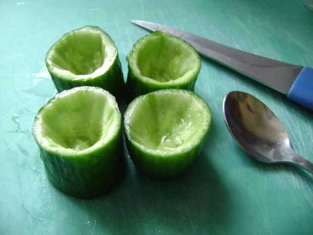 Lavar los pepinos. Corte los extremos y luego cortar cada pepino en 4 secciones. Ahuecar el pepino con un emparejamiento cuchillo o una cuchara pequeña.