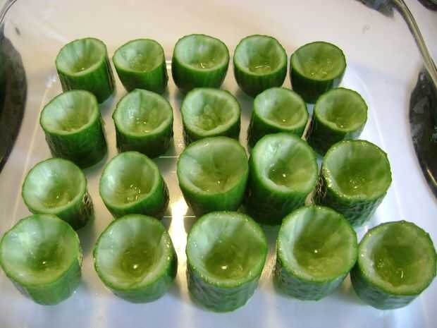 Vierta el líquido en las copas de pepino y enfriar en la nevera hasta que cuaje.