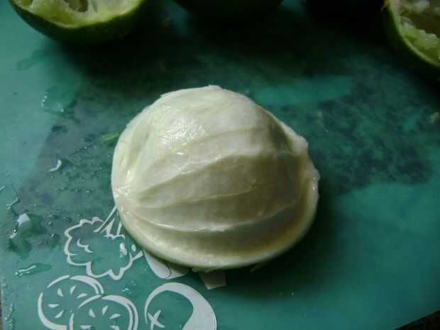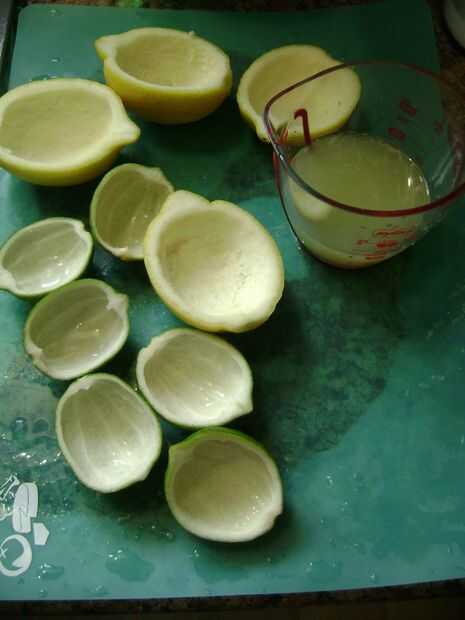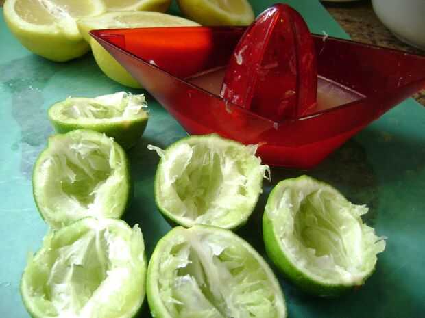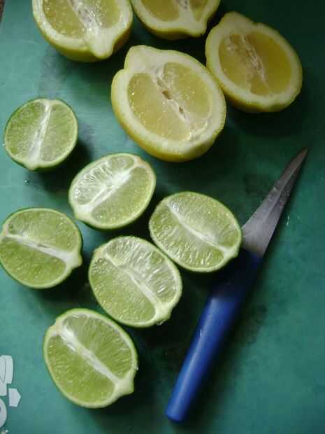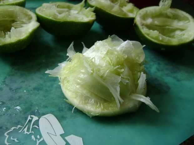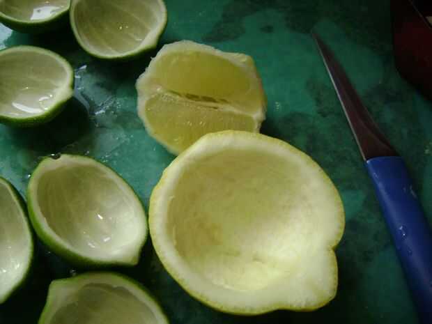 Lavar las limas y limones. Cortar los limones por la mitad y exprima el jugo. Vuelva al reves las mitades de limón y quitar la pulpa. Para los limones puede utilizar un cuchillo para cortar el interior.