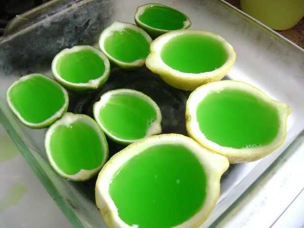 Mezclar el polvo de gelatina con 1 taza de agua hirviendo. Revuelva hasta que se disuelva completamente. Añadir 1/3 taza de Triple Sec y 2/3 taza de Tequila. Vierta el líquido en las mitades de Lima y limón y enfriar en la nevera hasta que cuaje.