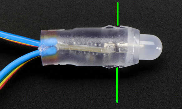 Entonces todavía con la plantilla con agujeros, perforar 25 LED. Los LEDs de AdaFruit tienen un reborde de silicona en el exterior de ellos montan perfectamente en los agujeros perforados en 12mm. En la foto se puede ver la brida y he utilizado una línea verde para indicar que el plástico ABS participarían el reborde para sujetar el LED en su lugar.