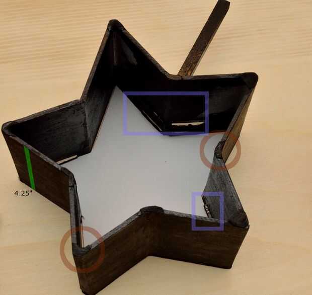 El primer paso en la creación de la estrella realiza una plantilla imprimible para forma el marco de madera y el plástico. Después de escalar e imprimir la plantilla con el tamaño apropiado tomé un pedazo de madera de 4,25 "x 0.125" en la tienda de artesanía y midió la distancia necesaria para cada lado de la estrella. No realmente bisel cualquiera de las articulaciones cuando les estaba cortando así formando la estrella requiere apoyo para mantener las piezas en su lugar mientras se pega.