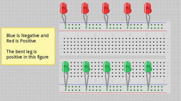 Comenzar colocando 5 LEDs del mismo color en uno de los extremos del tablero con el + y - firma en él. Asegúrese de recordar poner la más positiva. Luego tome otro color y lugar 5 de la misma manera en el otro lado de la Junta. Cuando haya terminado, debería verse como la imagen que se muestra