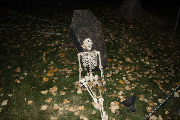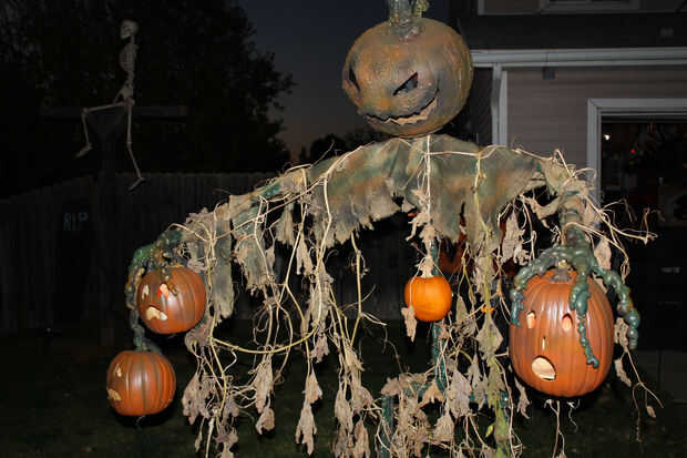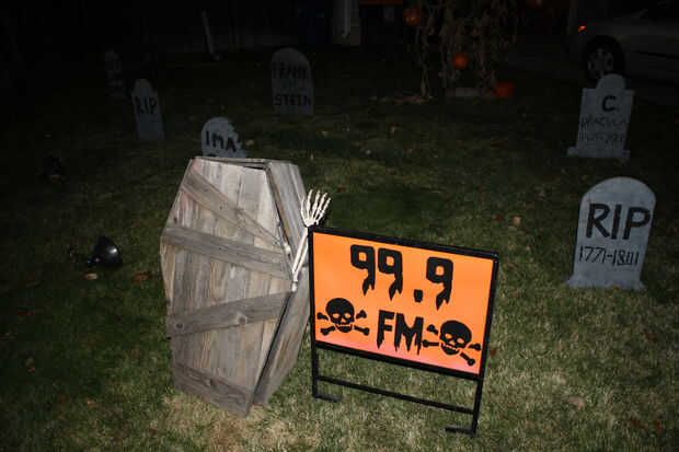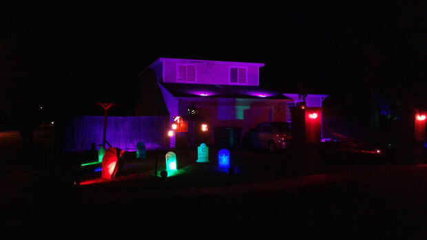 Para mi show que tengo 16 spot luces led y luz de inundación de 8 rgb. Montón de calabazas, esqueletos, ataúdes, lápidas. Todas las cosas buenas. Transmitir la música a la señal de radio. Usted puede comprar un transmisor fm en amazon o en ebay por unos $20-$30 por una buena. Aquí hay mayor se muestra, disfrutar de: