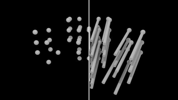 Crear cilindros con diámetro ligeramente mayor que las fibras ellos mismos (usa cilindros de 2,4 mm para mis fibras de 2 mm), que terminan en el centro de las esferas que ha creado. Orientarlos para que no haya ningún solapamiento, pero todos ellos más o menos apuntar hacia el mismo origen e imaginar cómo el resultado se verá como al final. Espero que las imágenes ayuda un poco.
