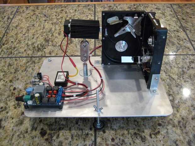 He buscado en Internet y encontrado varios sistemas de proyección láser DIY. Éste utiliza unidades de disco duros antiguo y un láser rojo y éste utiliza unidades de disco duros y una controladora Arduino para cambiar el color de un laser RGB. Decidí usar solo un láser rojo y deja los componentes expuestos.