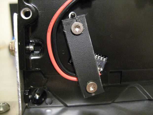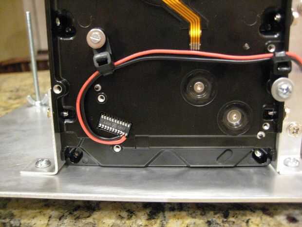 Las bobinas de voz de los brazos del actuador están conectadas directamente a los terminales de altavoz del amplificador. Un disco duro está conectado al salida del altavoz izquierdo y el otro para el altavoz derecho hacia fuera. Usted puede intentar soldar el + y - conduce al final de la bobina de voz de bobina los cables que suelen terminan cerca de la base del brazo actuador pero me pareció mucho más fácil soldarlos donde termina el cable de cinta en la parte inferior de la unidad de disco duro por debajo de donde estaba la placa de circuito. Para encontrar los puntos de contacto correcto, conecte el cable del altavoz del amplificador, potencia, empieza a jugar algo de música y luego presione los extremos de los cables a cada par de contactos hasta que escuche la música. Los cables de la soldadura y luego fijarlos. Puede utilizar una gota de pegamento caliente o epoxi pero lo que hice fue tornillo una pequeña tira de plástico cortada de la parte superior de una Sterilite totalizador plástico tapa negra, en el caso de mi conexión de soldadura vino flojo y necesitaba volver a soldar.