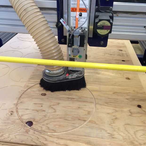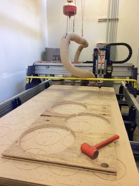 1 1/2" madera contrachapada se cortó en una máquina CNC para crear 16 1/2" círculos de diámetro para las tapas.