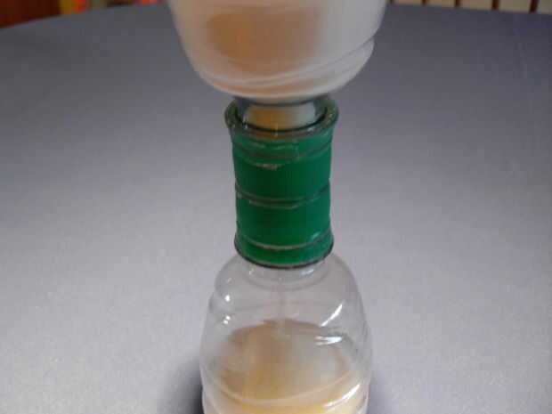 Luego, voltear una botella encima de la otra y pegan las tapas.