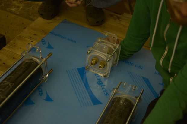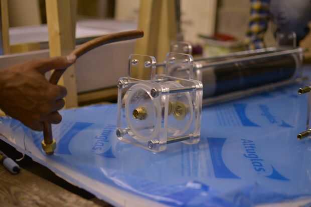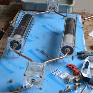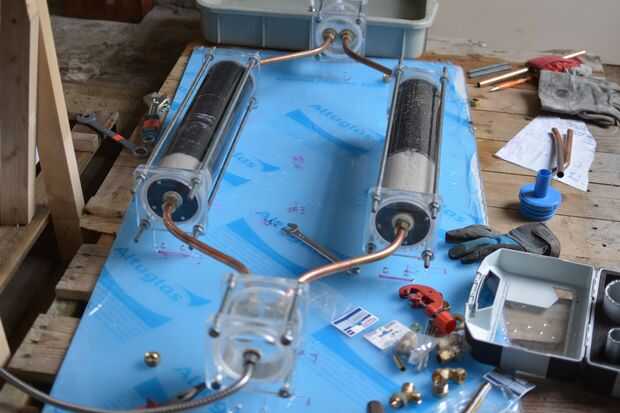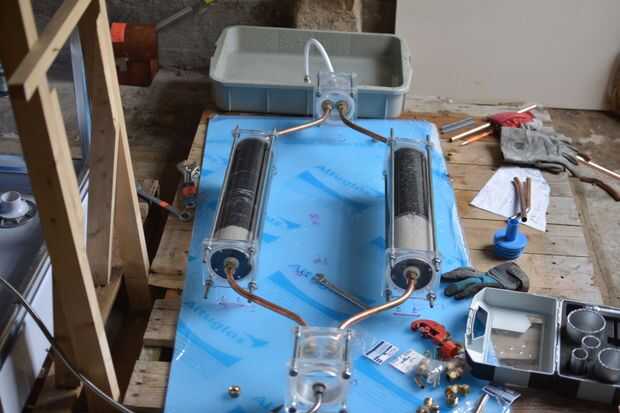 Finalmente listo para probar los filtros conectando una manguera de ducha a la entrada y salida de los reguladores de flujo.