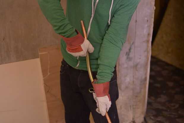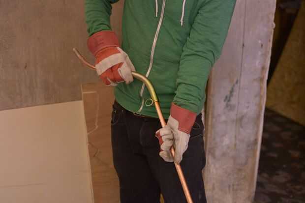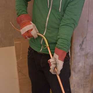 Conceptos básicos - el tubo de cobre con soplete de calentamiento. Enfocar la llama en las áreas arriba y abajo de donde haces el doblez para que parte no consigue más caliente y por lo tanto más débil que el resto del acero. Una vez que el cobre se vuelve negruzco y comienza hacer un fresco psicodélico efecto arco iris sabes el cobre es lo suficientemente caliente para comenzar a doblar. Apague la flama y espere un momento. Una vez que la pipa se haya enfriado un poco uso la herramienta dobladora de tubos, de modo que una curva apropiada. Esto es más arte que técnica y sólo tienes que observar y ver cómo se dobla el metal. No ponga demasiada presión en un punto, esto puede resultar en un tubo torcido. Desea mantener el diámetro de la tubería interna tan uniforme como sea posible. Utilizar una herramienta de doblez.