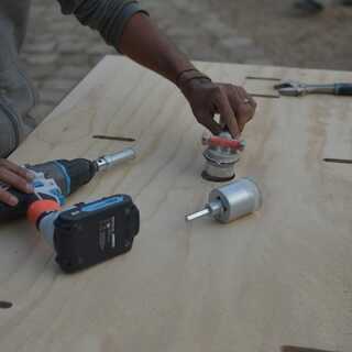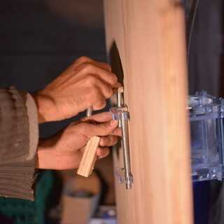 Use una sierra de círculo para cortar los agujeros para el mezclador de agua fría y caliente.