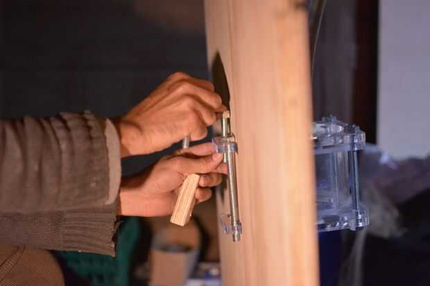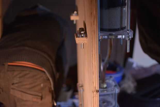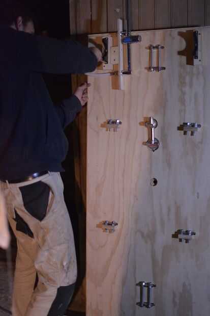 Inserte las placas de montaje a través de la pared y usando pernos o varilla roscada cortada, arandelas y tuercas fijar el filtro y placa de montaje o el regulador a la pared. Los agujeros donde un poco demasiado lejos hacia fuera para el montaje de placas tan allí era demasiado grande de un boquete a utilizar frutos secos para mantener todo juntas, así que cortaron algunos contrachapado de 20mm y agujeros adjunto (en las mismas posiciones como las placas de montaje) para obtener un ajuste ajuste entre la placa de montaje, madera contrachapada y la pared.
