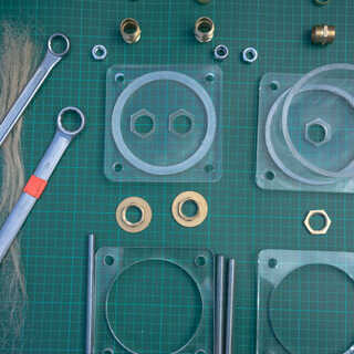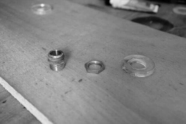 Una tuerca hexagonal se utiliza para sujetar la entrerrosca de la manguera (hacia el filtro) a la tapa del filtro. Las dimensiones del hexagonal tuercas o manguera de pezones pueden variar regionalmente por lo que es mejor conseguir primero, comprobar las mediciones y modificar el archivo si es necesario. En la foto de la tapa sólo un círculo fue grabado al agua fuerte/molido en la tapa de acrílico para adaptarse a la tuerca hexagonal, pero el diseño fue revisado más adelante para tener la forma de la tuerca hexagonal se así la fijación de la tapa para que ya no podría rotar (y evitar la fijación) al agregar la entrerrosca de la manguera en el lado exterior de la tapa.