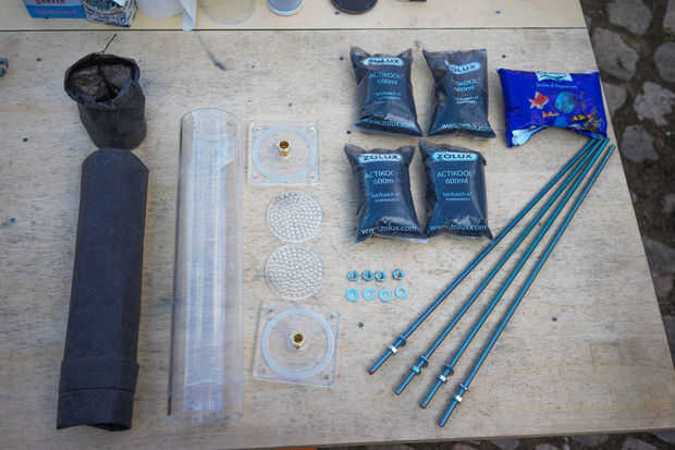 Los párpados y las placas de montaje también pueden ser una sola pieza si está utilizando material grueso. Cuatro filtros de 10cm de diámetro x 50 cm deben tener un adecuado caudal de 10 l/min. Con 6.6 l/min dos filtros son suficiente y 1 filtro de 3.3 l/min. La superficie es más importante que la longitud del filtro, ya determina la velocidad de flujo a través del filtro y así los tiempos de reacción. Utilizar hojas de acrílico grueso de 10mm para las tapa y compresión de los discos pero he utilizado hojas de acrílico de 4-5mm en anteriores prototipos y pegado junto con resultados decentes.