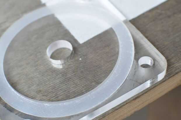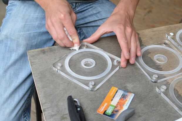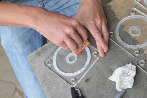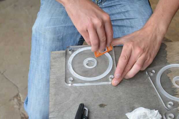 * Este paso puede omitirse por fresado un empaque de hojas de silicona con la misma profundidad que la 'depresión' en la tapa. No tengo muchos consejos en la selección del material (caucho o silicona) pero hay tiendas especializadas que puedan proporcionar Consejo sólido. Utilizo hojas de silicona. El material es mejor laser cortado a las dimensiones del canal mencionado. El archivo .ai se encuentra por encima de (Gasket.pdf) una ' pistola de silicona ' llenar el comedero circular con silicona hasta el nivel de superficie. Utilizar una tarjeta de plástico como una tarjeta de membresía que no le importa ensuciarse un poco y con fuerza, deslice la superficie plana a través y sobre la silicona. Está bien si pasa o está sucia como se puede limpiar más tarde. Asegúrese de que no hay burbujas ni distorsiones en la silicona. La superficie de la tapa se puede ahora limpiar papel higiénico pero evite las áreas cerca del canal hasta que ha endurecido ~ 24 horas más tarde. La silicona es más fácil de frotar apagado una vez que esté seco.