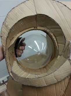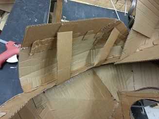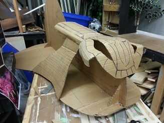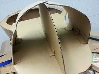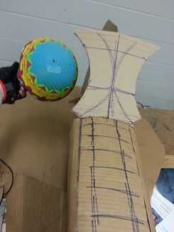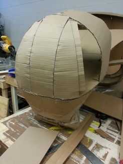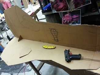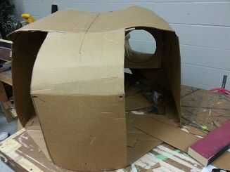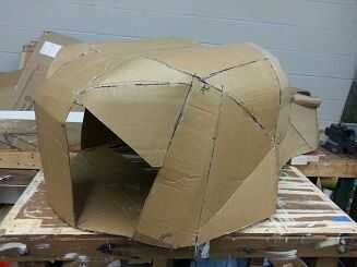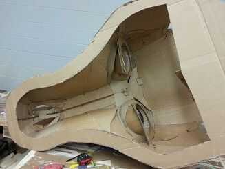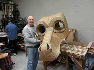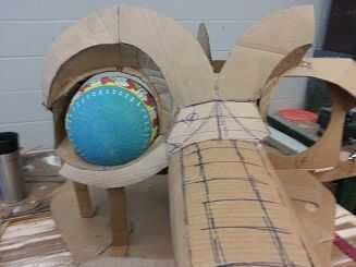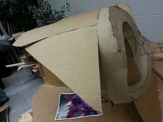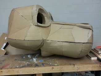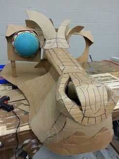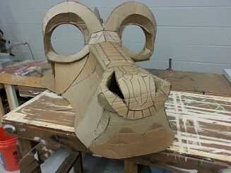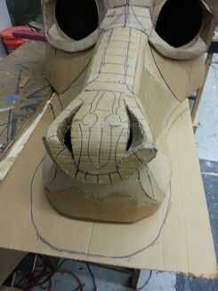 Empecé por buscar un cuadro de referencia después de determinar su cabeza sería cinco pies de largo, tres pies de ancho y cuatro pies de altura. Dibujaba líneas de referencia en el dibujo y trasladaron a un pedazo grande de cartón. A partir de ahí comencé sólo corte, doblez y pegado caliente para crear la forma de su cabeza.