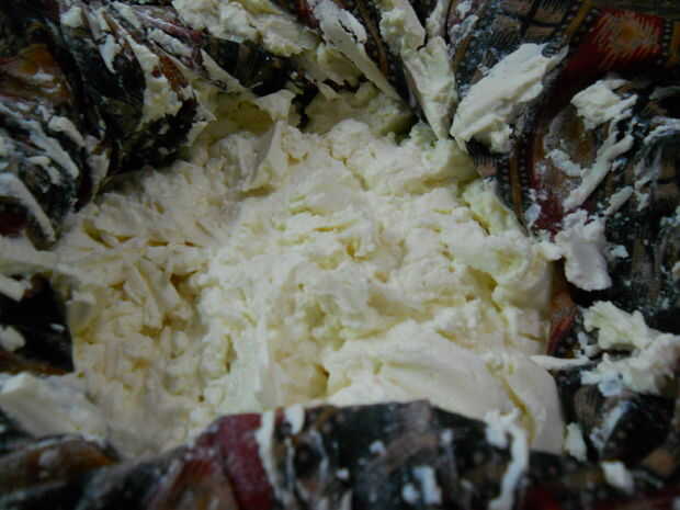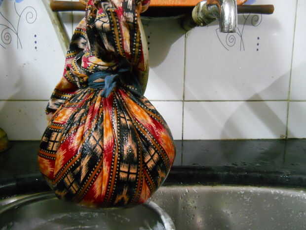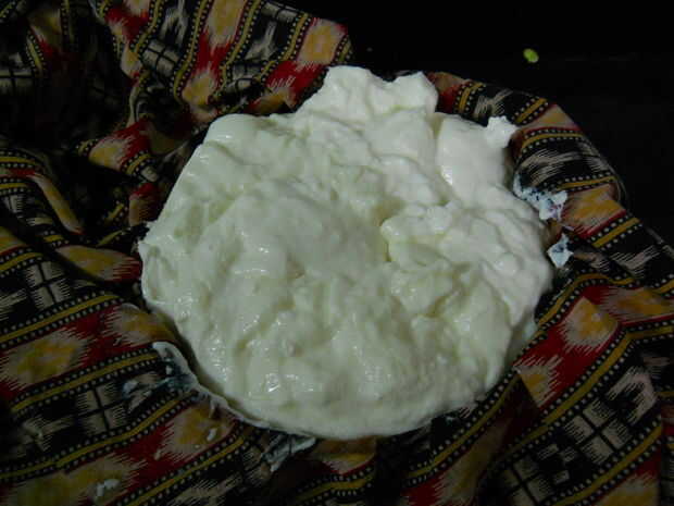 Tomar cuajada en un trapo (paño debe ser lo suficientemente espeso para que la cuajada no debe pasar a través de él y debe ser poroso lo suficiente para que el agua contiene en la cuajada puede ser goteada fuera cuando nos aferramos)