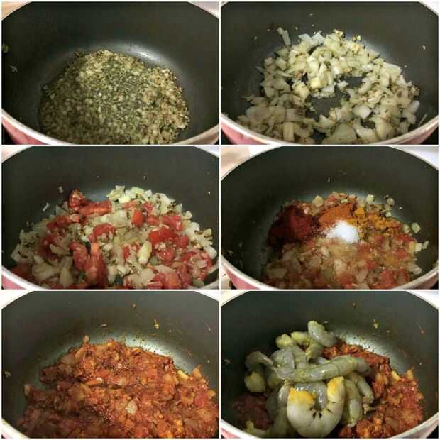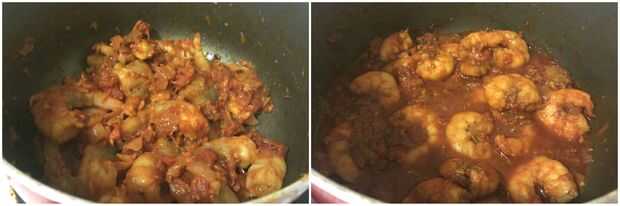 6. Agregue los camarones en ella y mezclar hasta que las especias bien con él.