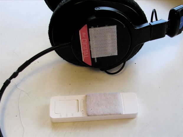 En el shuffle, el mejor lugar para poner el velcro está en la parte posterior, entre el tapón y el indicador de batería. Así, usted todavía tendrá acceso al botón de encendido mientras está montada. Todavía tiene acceso al indicador de tapa y la batería cuando se la quite.