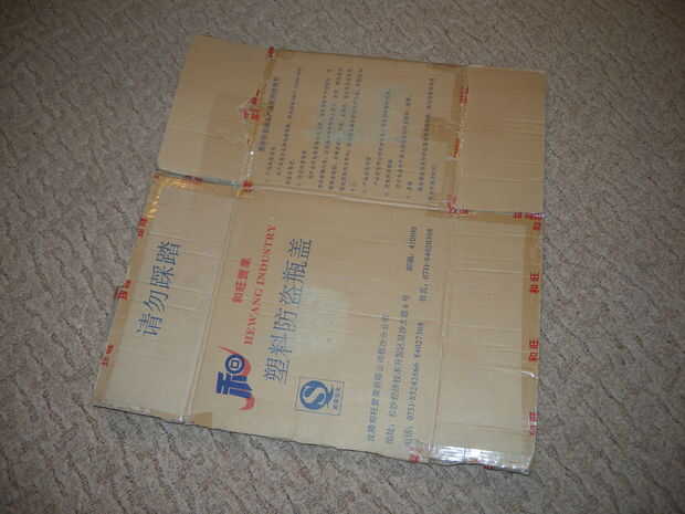 No tengo pintura de oro ni un lugar para utilizar pintura para solo el revés una caja de cartón. Así que no había ninguna escritura en el exterior. Suerte algún día y había dos cajas de cartón en el hueco de la escalera fuera un apartamento en uno de los pisos más bajos de mi edificio. Uno era apenas el tamaño correcto y no tengo que modificar la caja que no sea poner juntos adentro hacia fuera.
