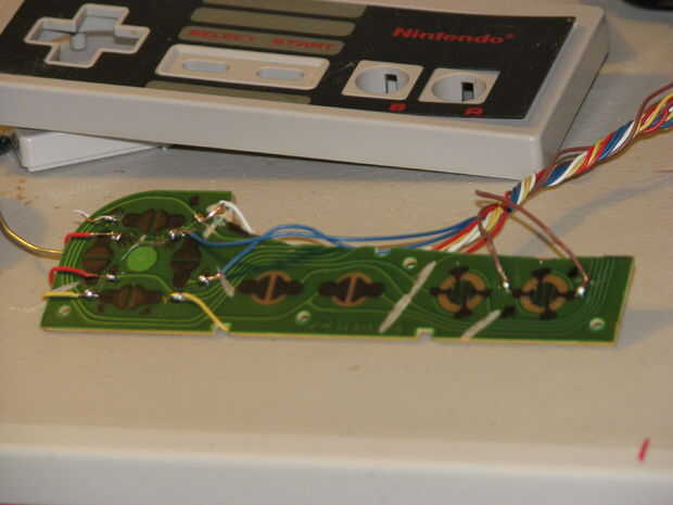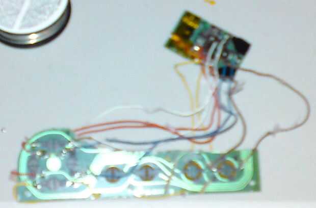Me pareció más fácil que si tuviera ya una pequeña gota de soldadura en cables de mi, esto me mantuvo se soldadura en un circuito muy pequeño. Conectar uno de cada cable de color a cada lado de la tecla deseada, he intentado mantener continuidad con el d-pad de los botones externos y A ser reproducir/pausa.