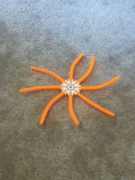 Cuento su 8 bendy barras naranja y lugar uno de los extremos de cada uno en cada una de las ranuras en el conector blanco. (mi consiguió doblaran)
