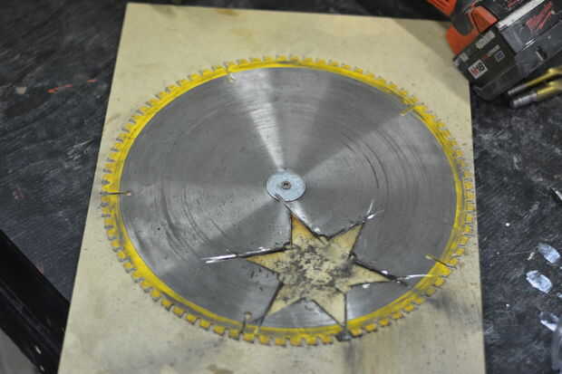 Tomé una hoja de sierra vieja y había atornillado a un tablón de madera, usando una arandela en el centro.
