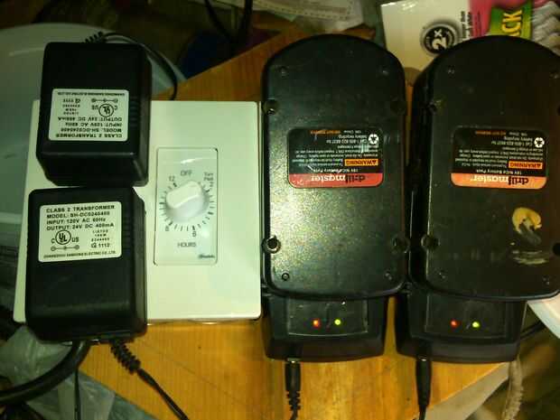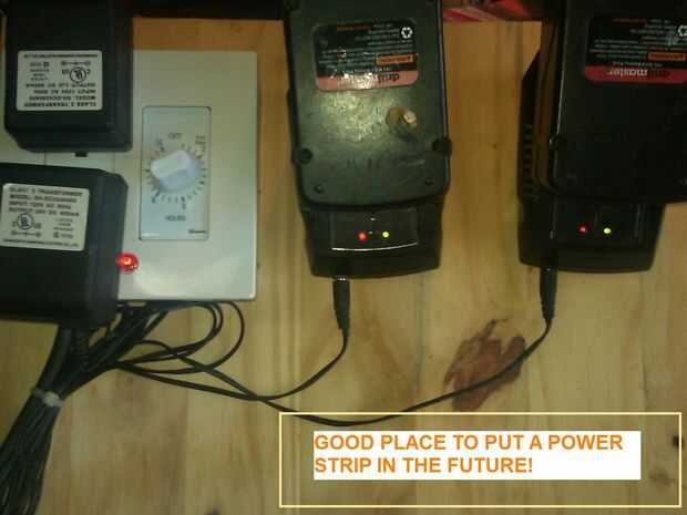 Editar EDIT: he añadido un tablero de respaldo a la unidad con madera contrachapada de 1/2 pulgada. También he añadido un piloto 120VAC a la cubierta de salida que se enciende cuando la corriente está fluyendo. Pienso montar las bases de cargador de taladro ejecutando un par de tornillos a través de la Junta de la parte posterior en la base de los cargadores. Luego usé una sujeción de cable a liar las cuerdas base cargador, maximizando portabilidad.