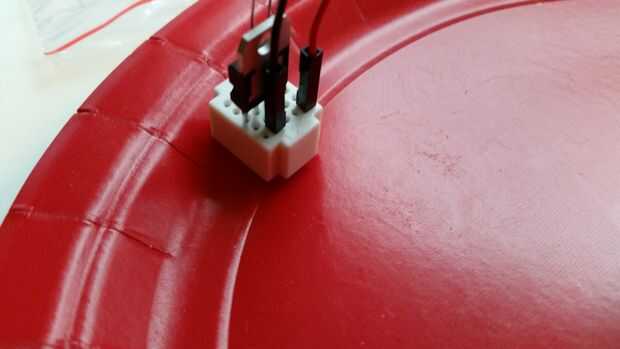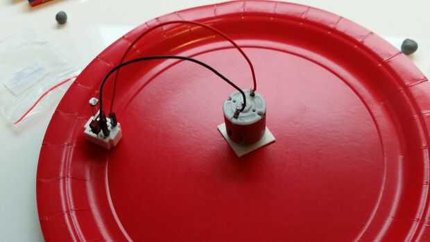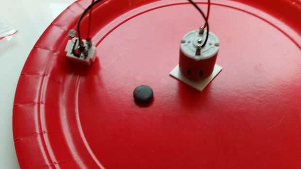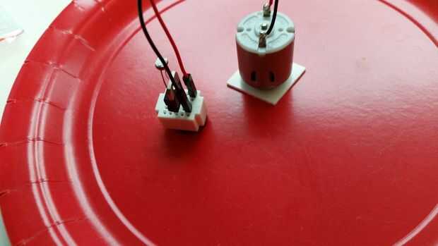 El cable rojo del motor va en el agujero de la esquina superior derecha de la placa. El cable negro del motor va en la columna de la derecha más lejos, cuarta fila de la parte superior. Use una gota de tachuela pegajosa para fijar la placa a la placa.