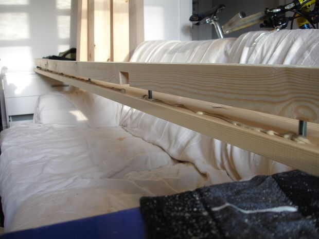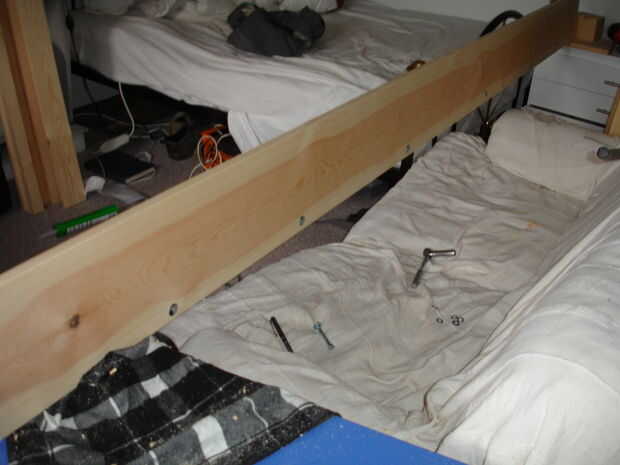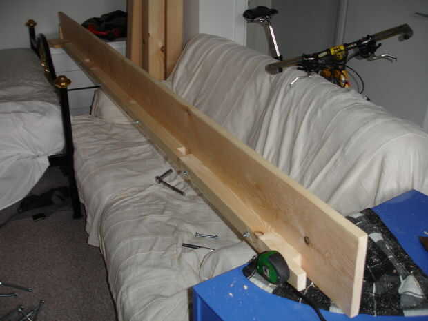 Esta operación de montaje de la parte era lo consideraba fundamental para todo el proyecto. Si estos no funcionan, el proyecto fracasaría. Tomar la carga de 2 personas, una cama de acero base y un colchón pesado y suspenderlos 1,8 metros por encima del suelo - de hecho un requisito oneroso. Por lo tanto, pasé mucho tiempo considerando cómo podría hacer estos Asamblea tan fuerte como sea posible, manteniendo buena mirar para que encajen en el esquema general del proyecto. Decidí que los carriles de sección 50 mm x 50 mm y sería a través de empernado a intervalos regulares y pegados a los carriles largos de la cama. Sentí que esta combinación le daría la última fuerza necesaria, y mediante el uso de pernos de coche en el exterior, la estética no sería comprometida ya sea. Por lo tanto, con los rieles de soporte cortados a la longitud, pasó algunos ajuste de tiempo la posición y los orificios de 6 75mm entrenador tornillos M8 que sostenga los rieles y sujetarlos mientras pegado.