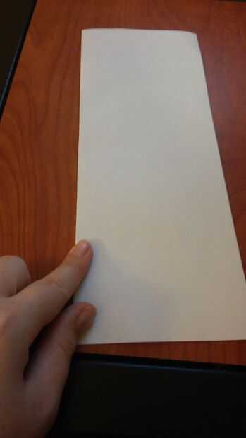 Comience aplicando la presión al centro del pliegue. Esto asegurará que los bordes son aún, una tarea que había fallado en cada intento antes de ser enseñado esto. Entonces, deslice su dedo a lo largo de la tapa para hacer un pliegue permanente en el papel. Partir de la parte superior del papel y deslice a lo largo en la parte inferior.