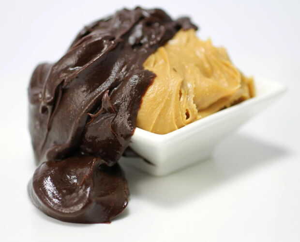 120 g (4 oz) mantequilla de maní de llenado 20g (3/4 oz) sin sal mantequilla a temperatura ambiente picar el chocolate en trozos finos Colocar en un recipiente seguro de microondas con la crema y el calor en el microondas a temperatura media baja por ráfagas de 1 minuto hasta que se derritan. Asegúrese de que no sobrecaliente el chocolate. Cubra y deje establecer a temperatura ambiente hasta que esté firme. Batir la mezcla de chocolate en alto por un par de minutos hasta que ilumina en color.