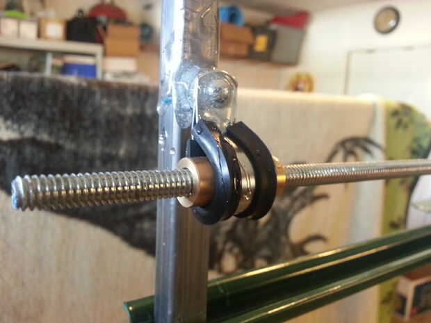 El buje de bronce es sostenido por la abrazadera de alambre soportes de goma. Tuve que usar una cuña de 1/4" para poner hacia fuera la barra sería paralela a la plataforma. Tienes que ser seguro de que tiene la tuerca de acoplamiento (que empuja/tira del carro) también se burlaban en su posición final, así tan vinculante es eliminado.
