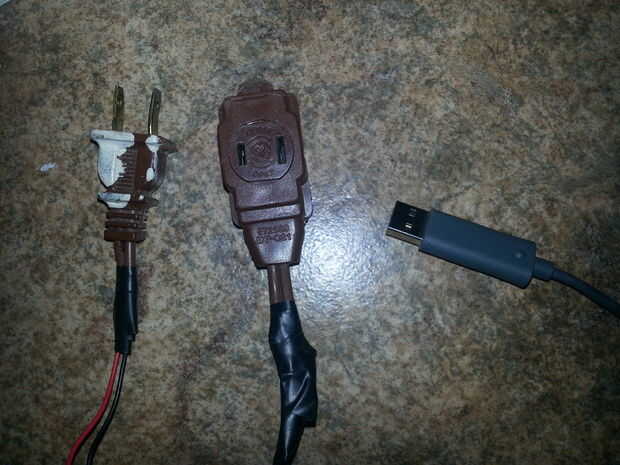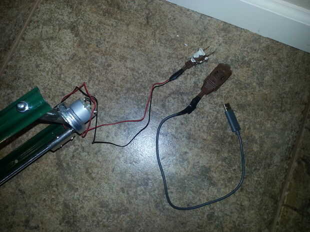 Tomé un viejo cable de extensión y corte los extremos para hacer una rápida conexión para el motor. Lo hice en lugar de cableado motor directo al enchufe USB porque el motor es reversible y al configurar fotos quiero la flexibilidad necesaria para ejecutar la plataforma rodante de cualquiera de los extremos, o en cualquier dirección y poniendo simplemente el enchufe puedo invertir la polaridad - y la dirección del motor.