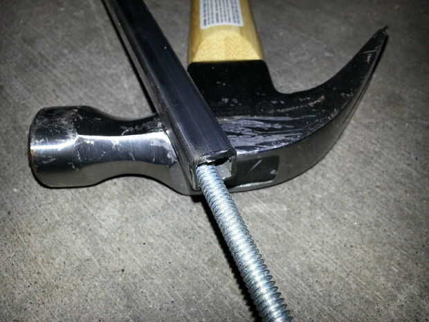 Siguiente hilo de la varilla a través de los postes y el tubo, apriete con una tuerca abierta en el extremo más largo, luego cortar la varilla a la medida. Retire la tuerca abierta y reemplazar con una tuerca ciega de un débil intento de lo que se vea bien.